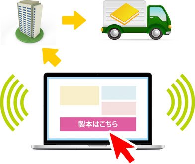御社のホームページに製本ボタンを貼り、注文が入ると製本直送.comが製本し、注文者のもとに直接お届けします。