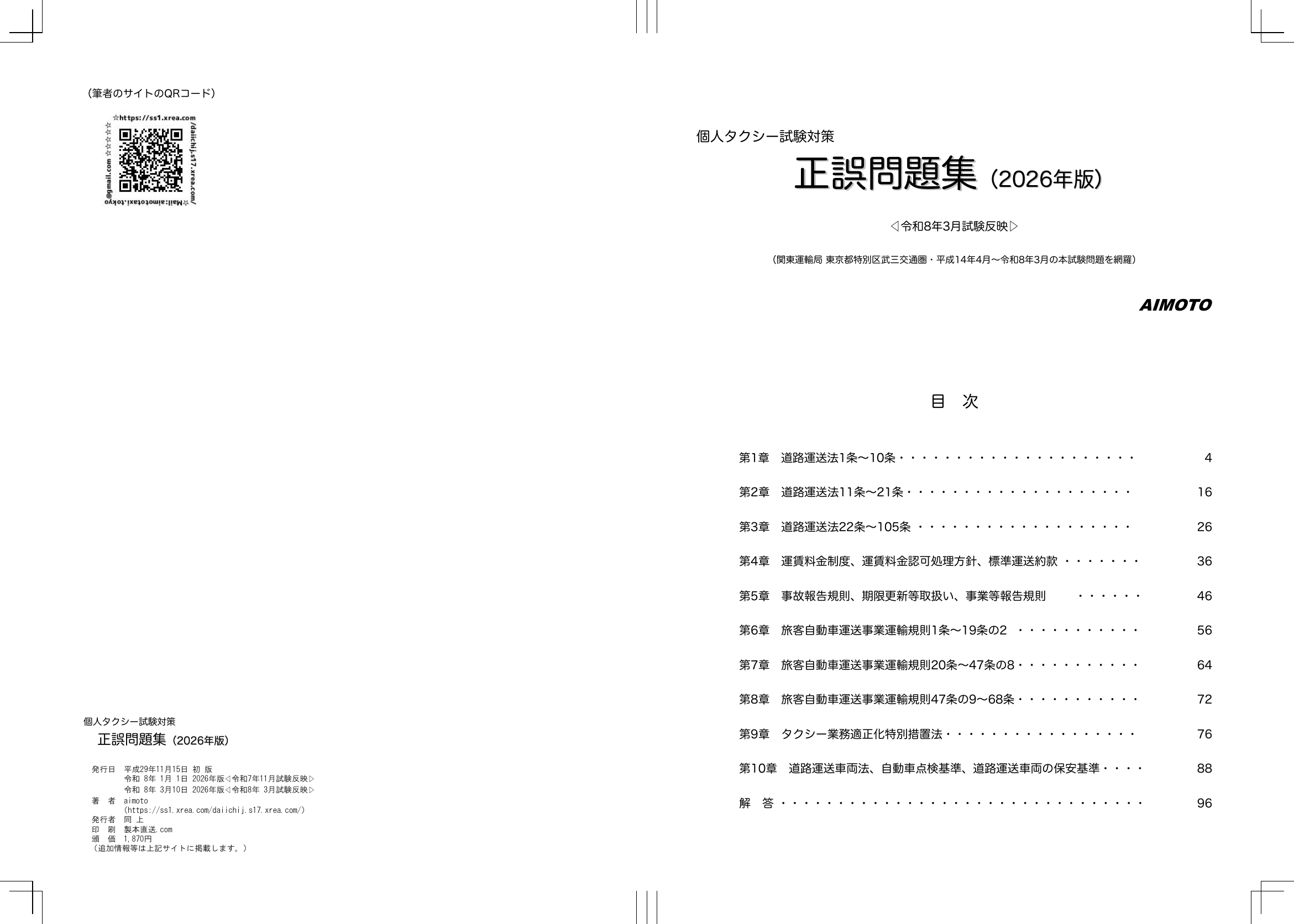 個人タクシー法令試験は、短文の正誤を判断する○×式の問題(以下「正誤問題」といいます。)と、条文の空欄に当てはまる字句を語群から選択する方式の問題(以下「語群選択問題」といいます。)の二つのパターンで出題されてます。いずれも過去に出題された問題が繰り返して出題されるのが特徴です。つまり、過去問の徹底マスターこそが合格への王道です。そこで、本問題集では、平成14年4月試験から令和8年3月試験までの関東運輸局で出題された正誤問題を掲載しました。