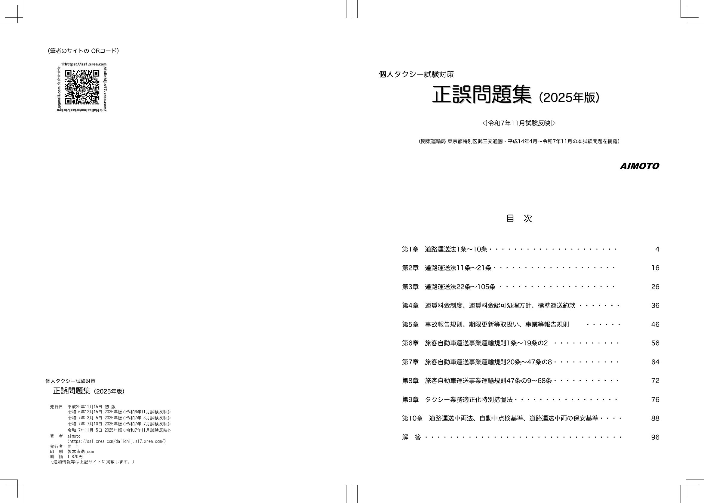 個人タクシー法令試験は、短文の正誤を判断する○×式の問題(以下「正誤問題」といいます。)と、条文の空欄に当てはまる字句を語群から選択する方式の問題(以下「語群選択問題」といいます。)の二つのパターンで出題されてます。いずれも過去に出題された問題が繰り返して出題されるのが特徴です。つまり、過去問の徹底マスターこそが合格への王道です。そこで、本問題集では、平成14年4月試験から令和7年11月試験までの関東運輸局で出題された正誤問題を掲載しました。