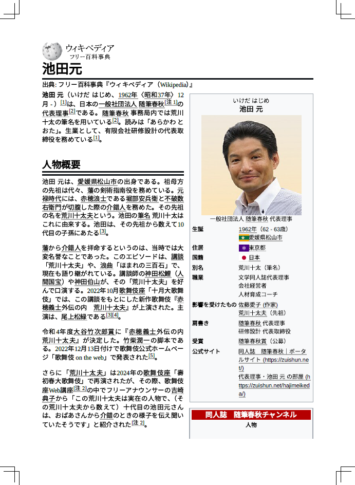 Wikipediaの記事をA4サイズの小冊子にしました。記事タイトルは「池田元」。導入部には以下の記述があります。「池田 元(いけだ はじめ、1962年〈昭和37年〉12月 - )[1]は、日本の一般社団法人 随筆春秋[注 1]の代表理事[2]である。随筆春秋 事務局内では荒川十太の筆名を用いている[2]。読みは「あらかわ とおた」。生業として、有限会社研修設計の代表取締役を務めている[1]」