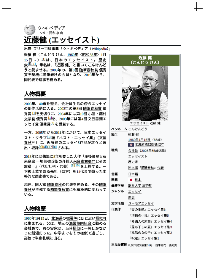 Wikipediaの記事をA4サイズの小冊子にしました。記事タイトルは「近藤健 (エッセイスト)」。導入部には以下の記述があります。「近藤 健(こんどう けん、1960年〈昭和35年〉1月15日 - )[1]は、日本のエッセイスト。歴史家[注 1]。筆名は、「近藤 健」と書いてこんけんどうと読ませる。2003年の、第8回 随筆春秋賞 優秀賞を契機に随筆春秋の会員となり、2019年から、同代表で理事を務める」